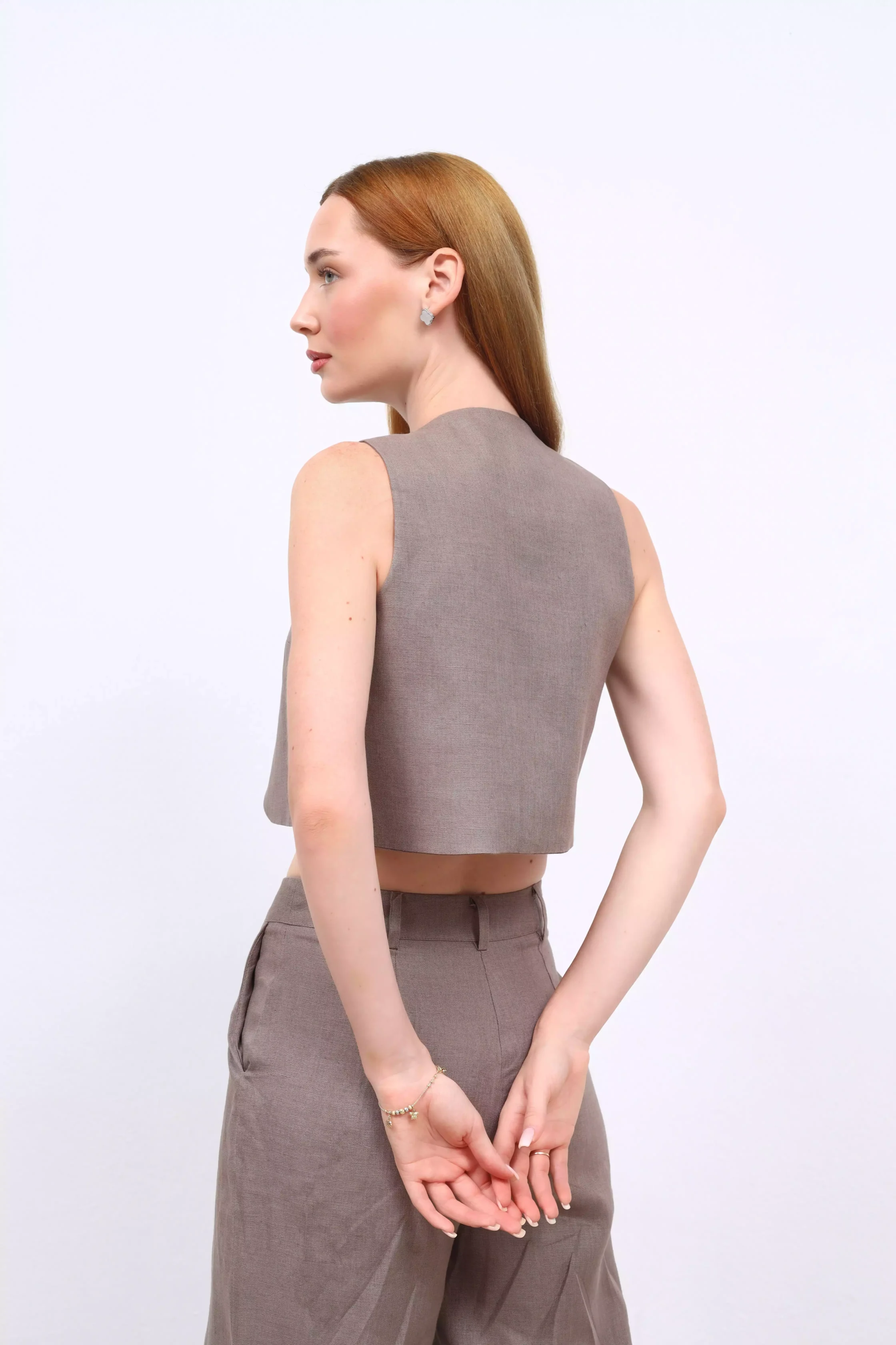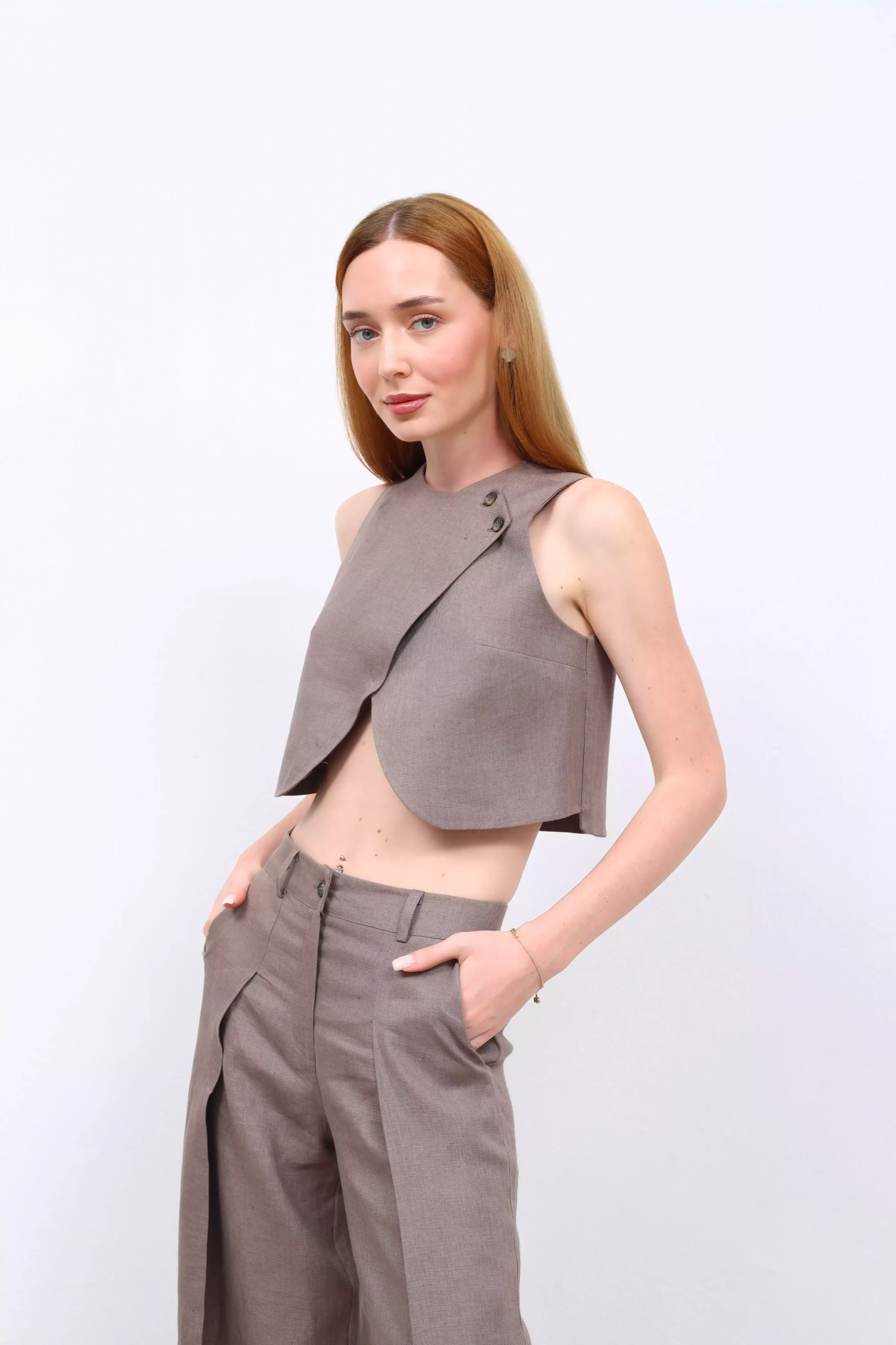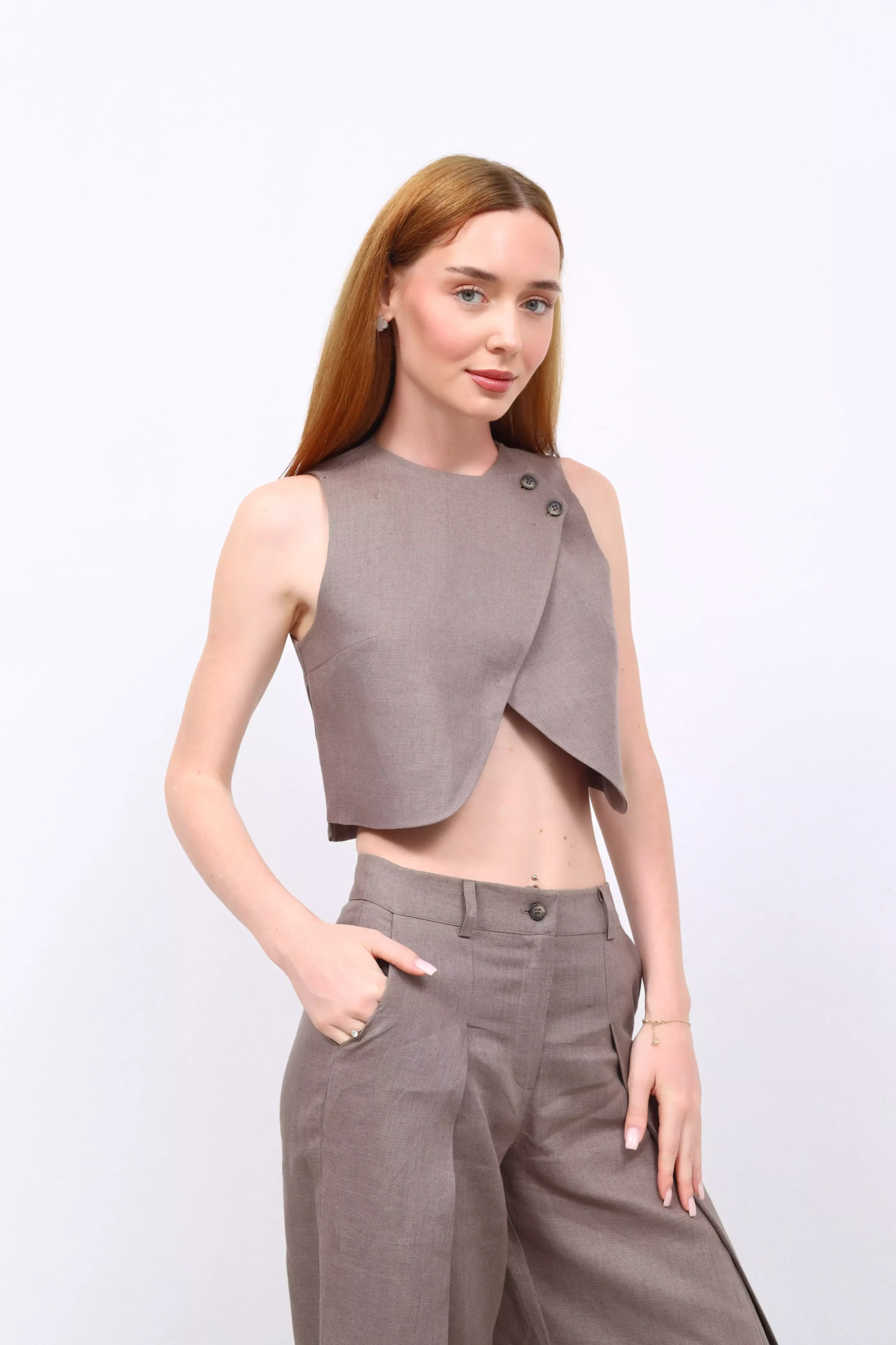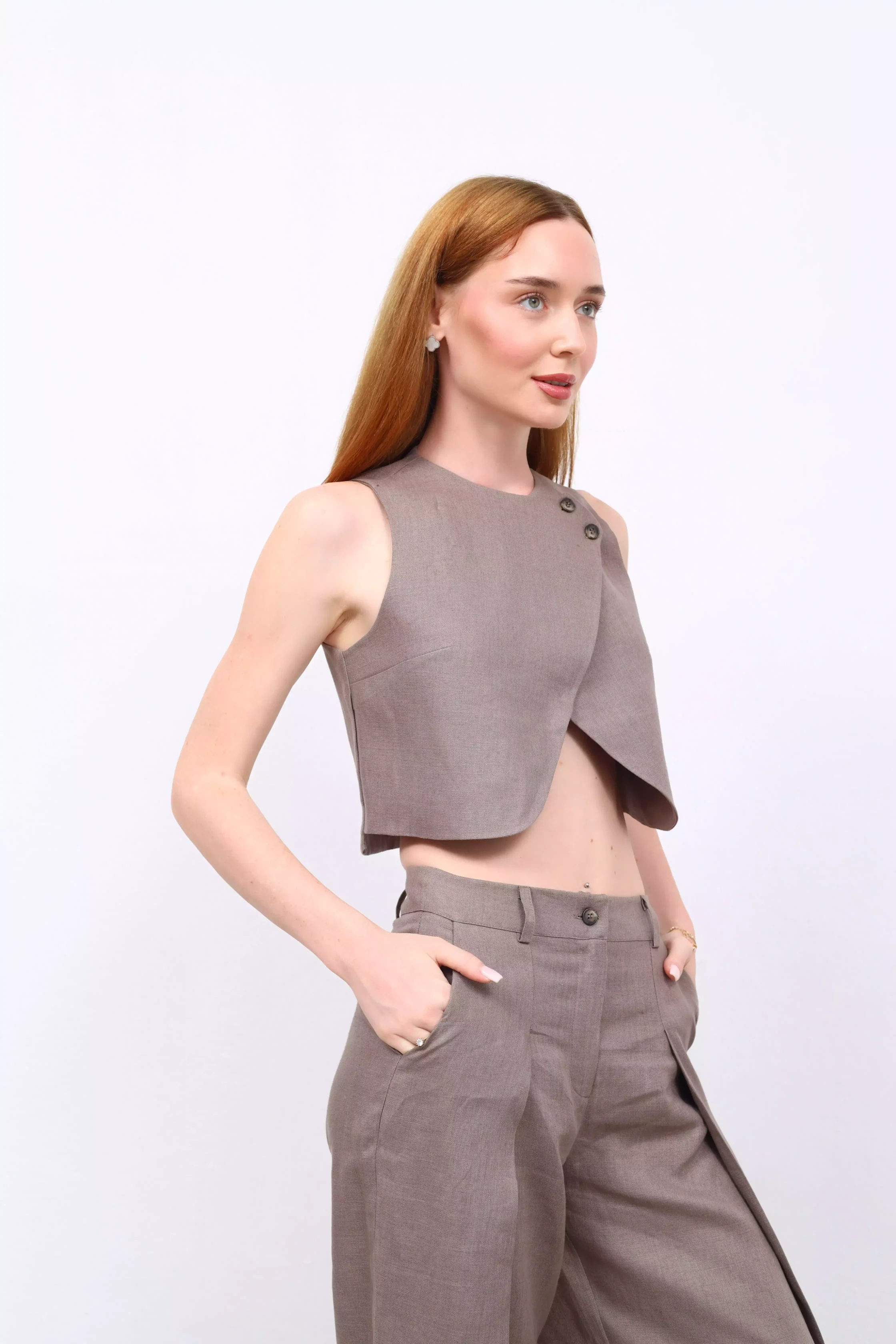 Lumi – Keten Kruvaze Yelek, zarif bir duruş ve rahatlığı bir araya getiriyor. Doğal keten kumaşı sayesinde nefes alır, sıcak günlerde bile serinlik sağlar. Kruvaze kesimi, klasik şıklığı modern dokunuşlarla buluştururken, ince işçiliğiyle dikkat çeker. Günlük kombinlerde veya özel davetlerde stilinize sofistike bir dokunuş katmak için mükemmel bir tercih.